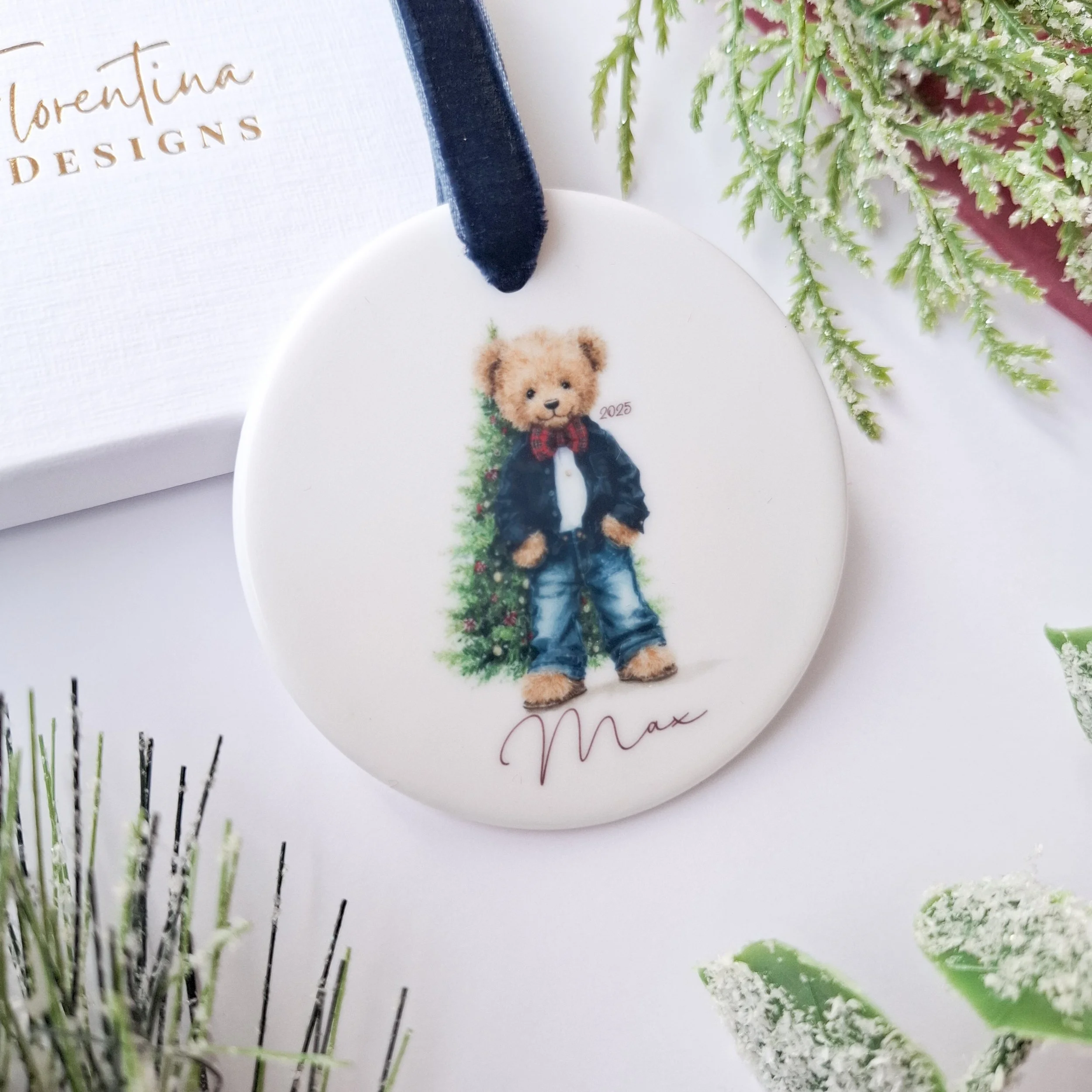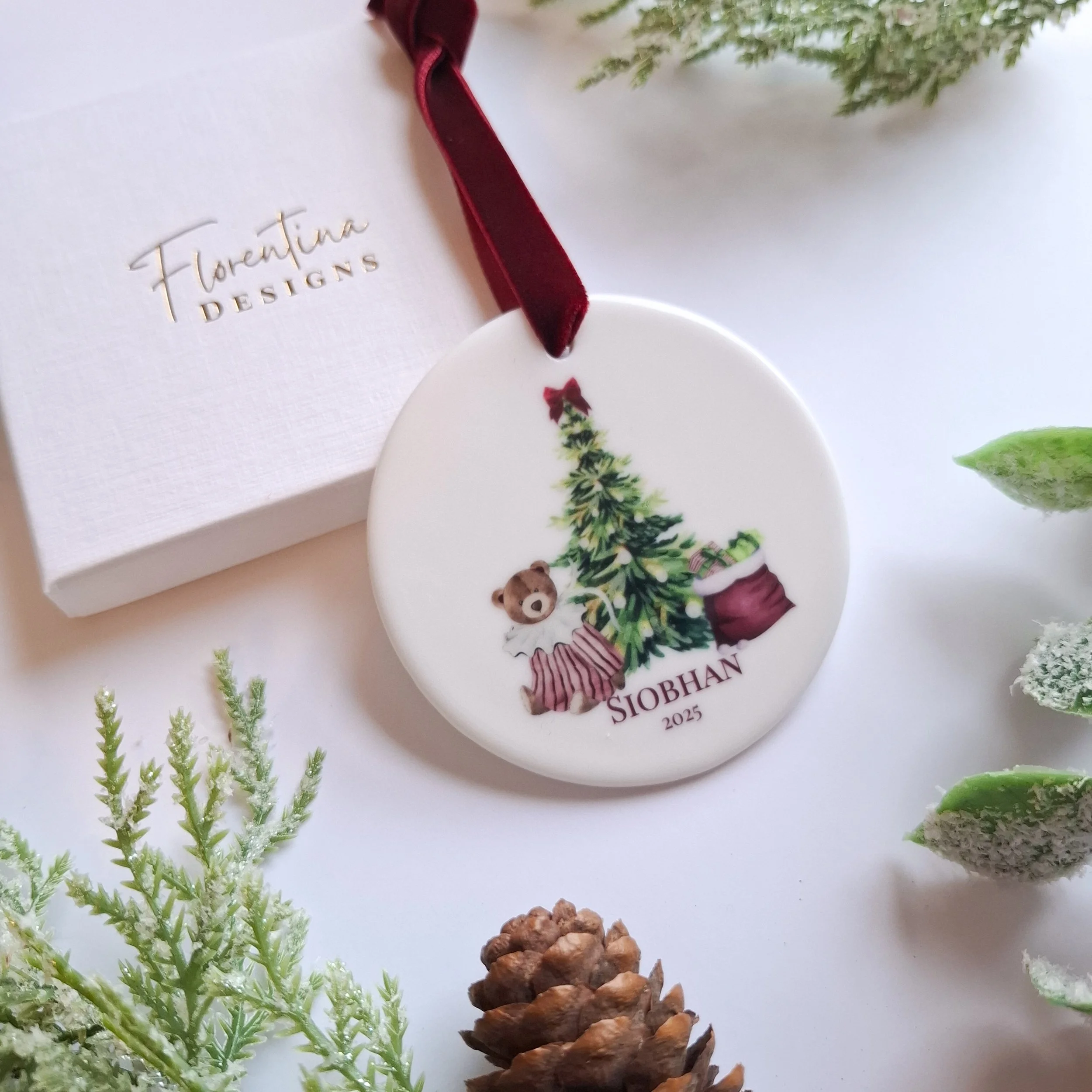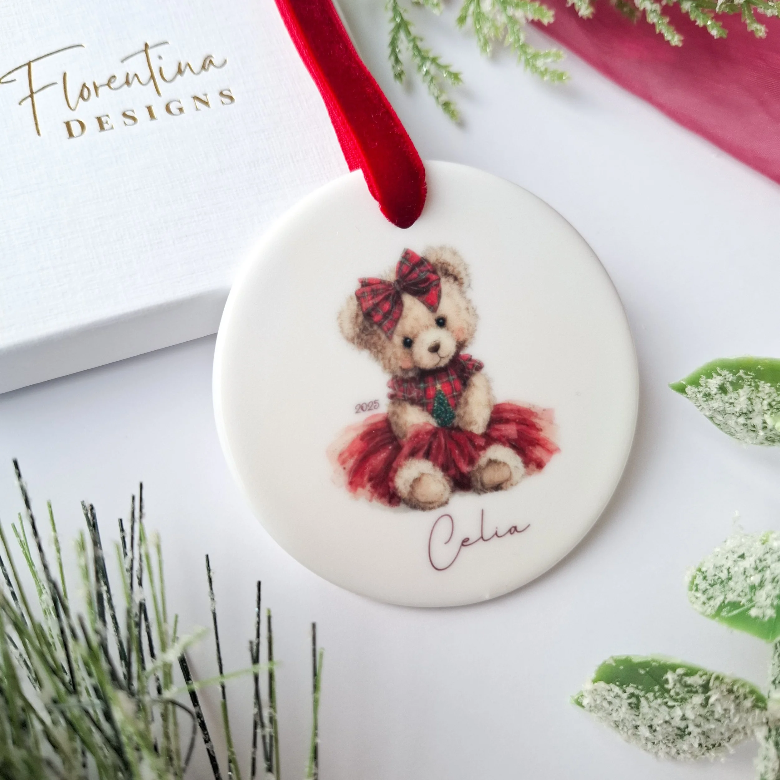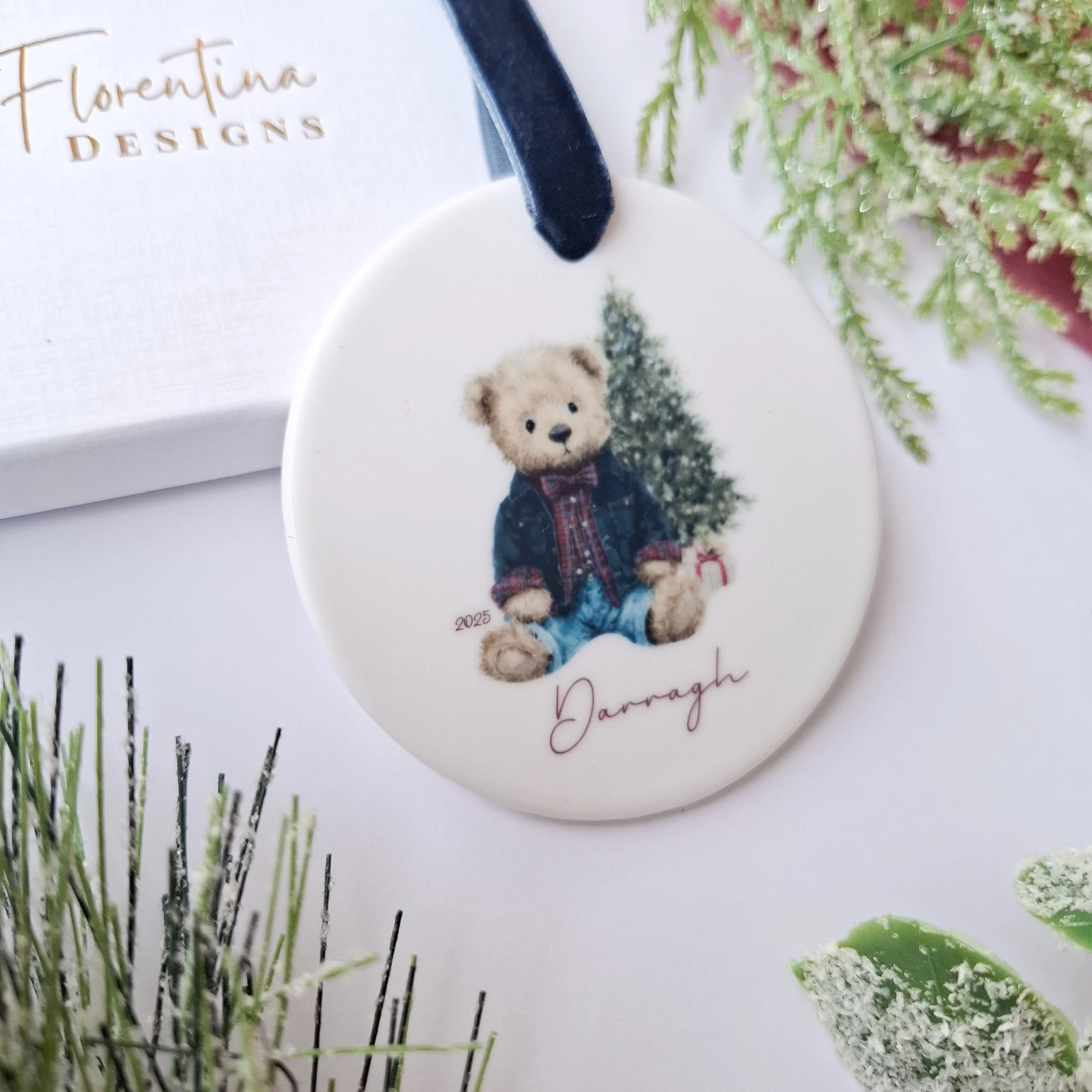 Personalised 2025 Ceramic Christmas Decoration – Teddy Bear with Gift (7.2cm)
