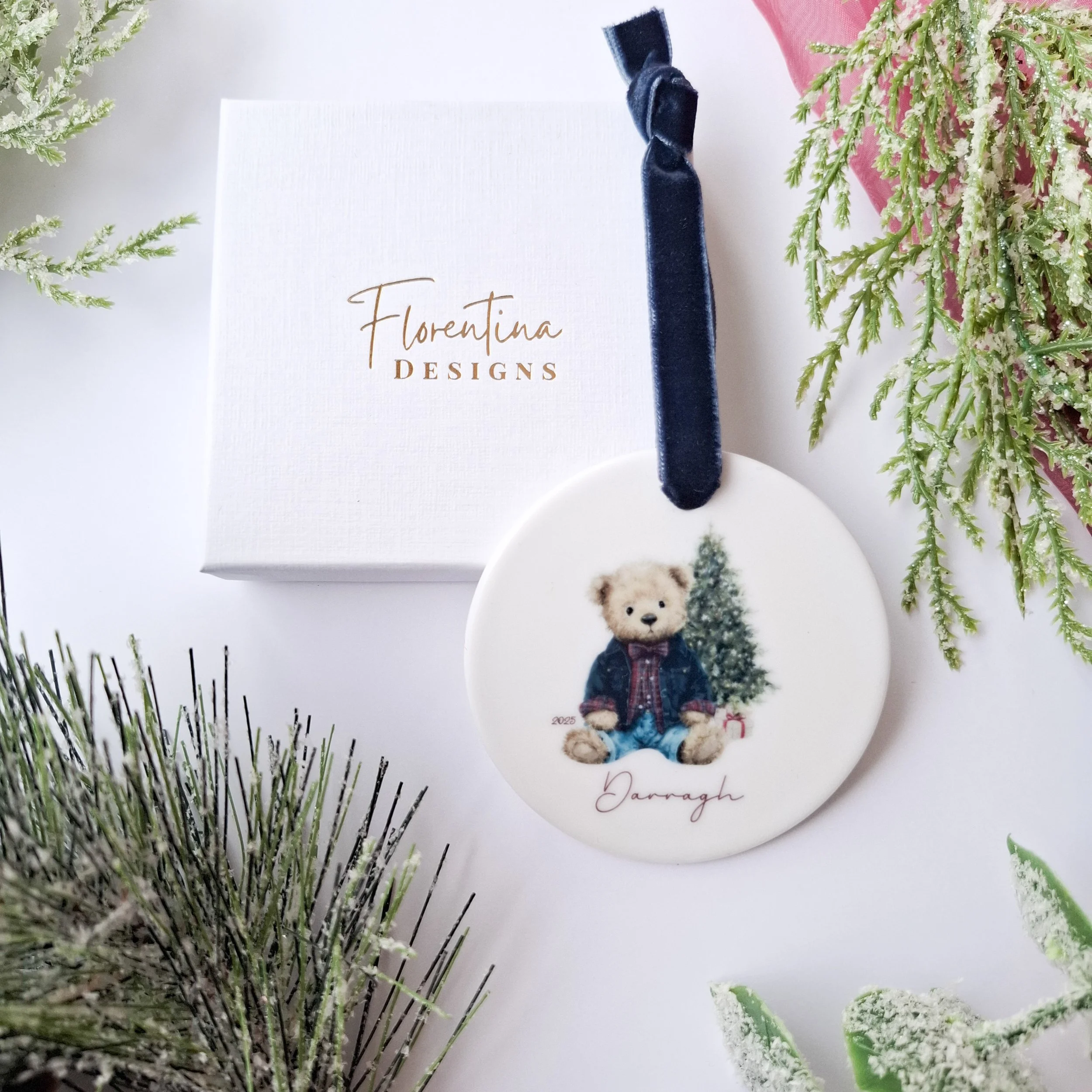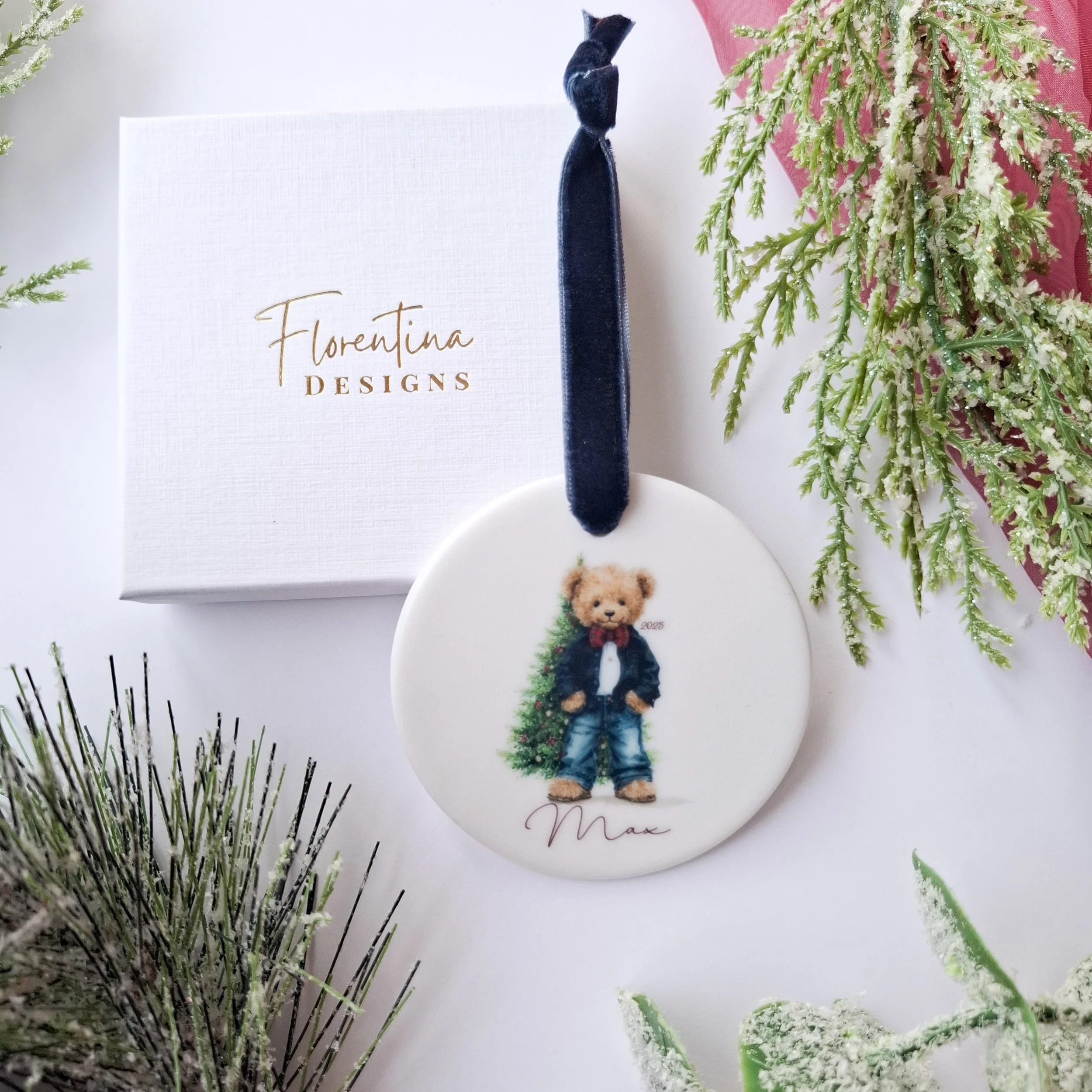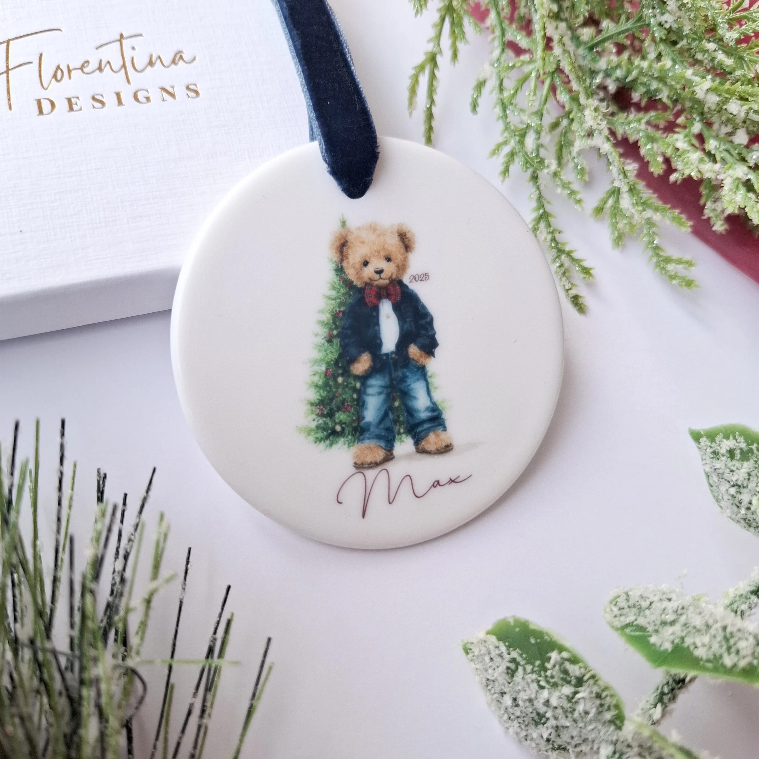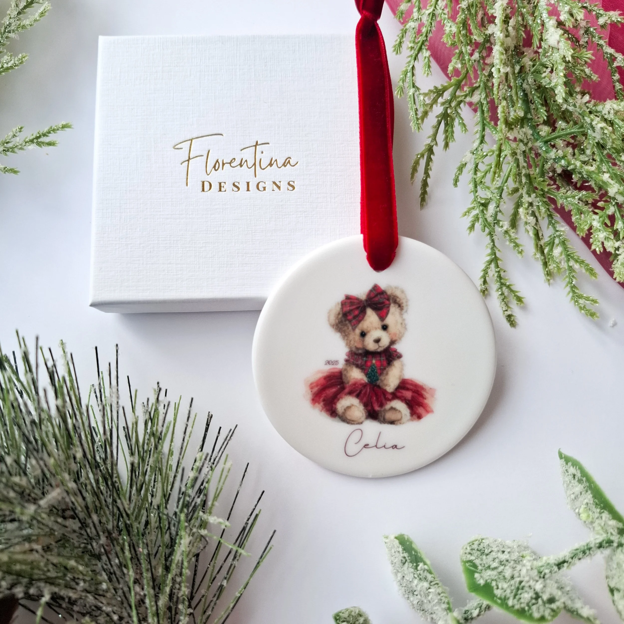 Personalised 2025 Ceramic Christmas Decoration – Teddy Bear with Gift (7.2cm)