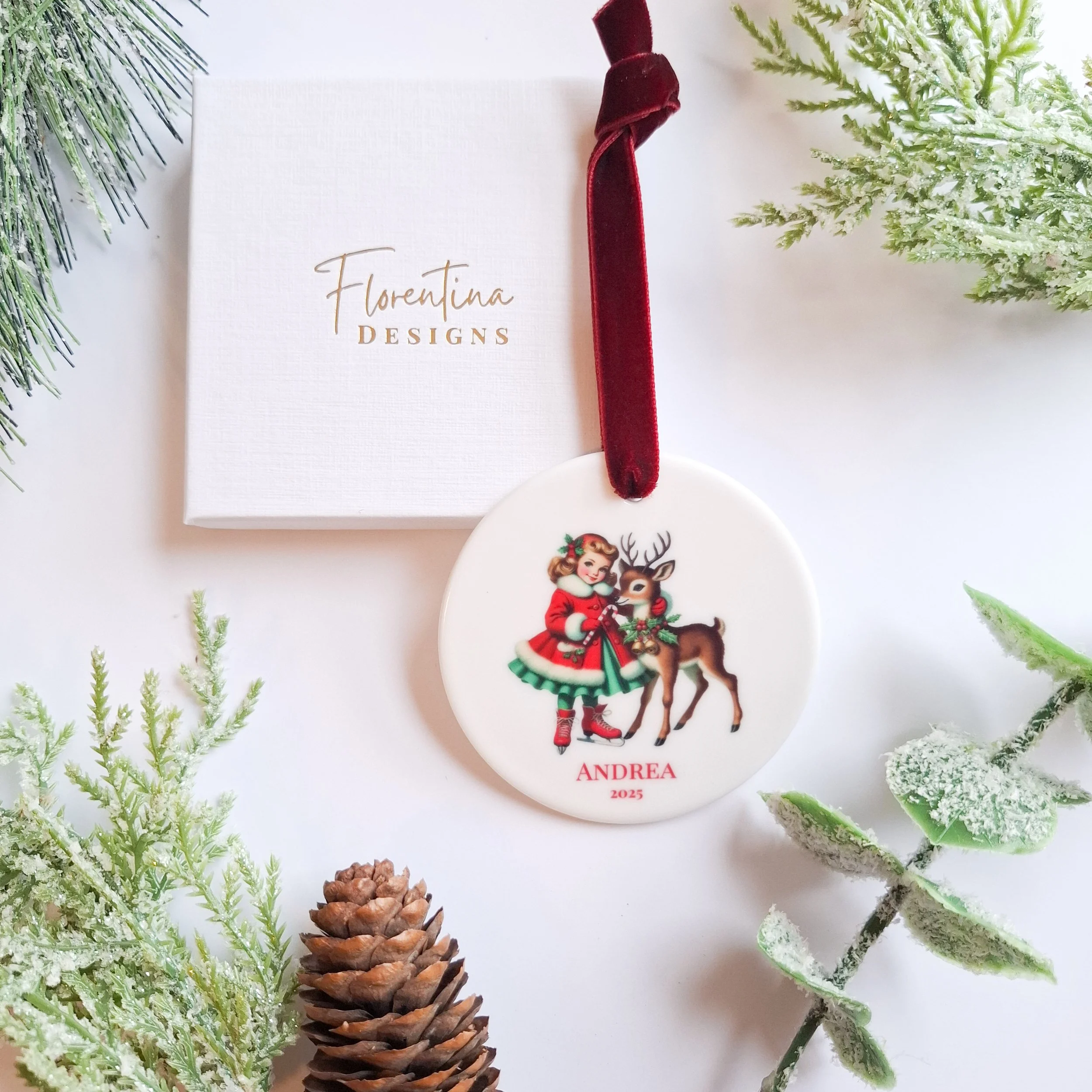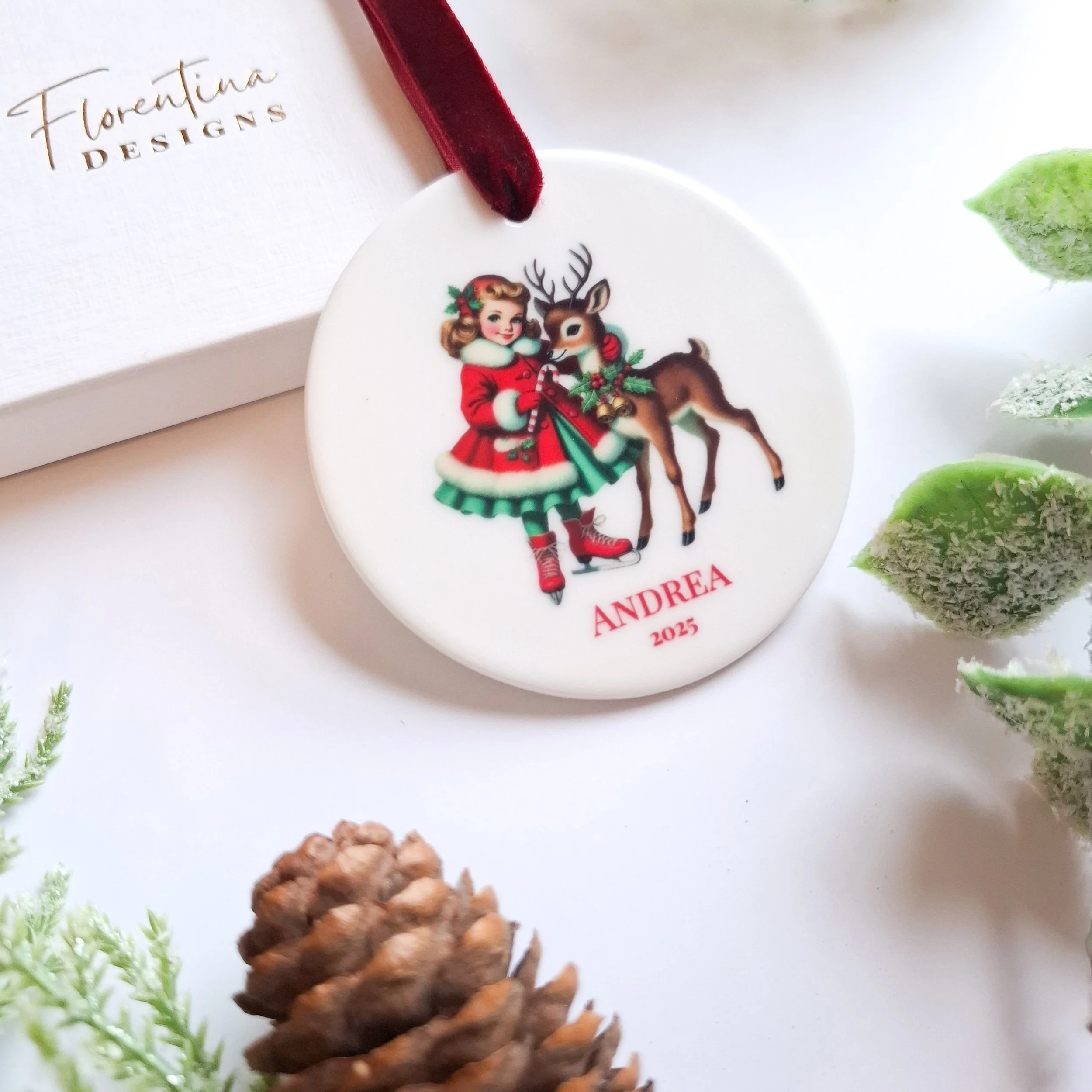 Personalised 2025 Retro Vintage Girl & Reindeer Ceramic Ornament