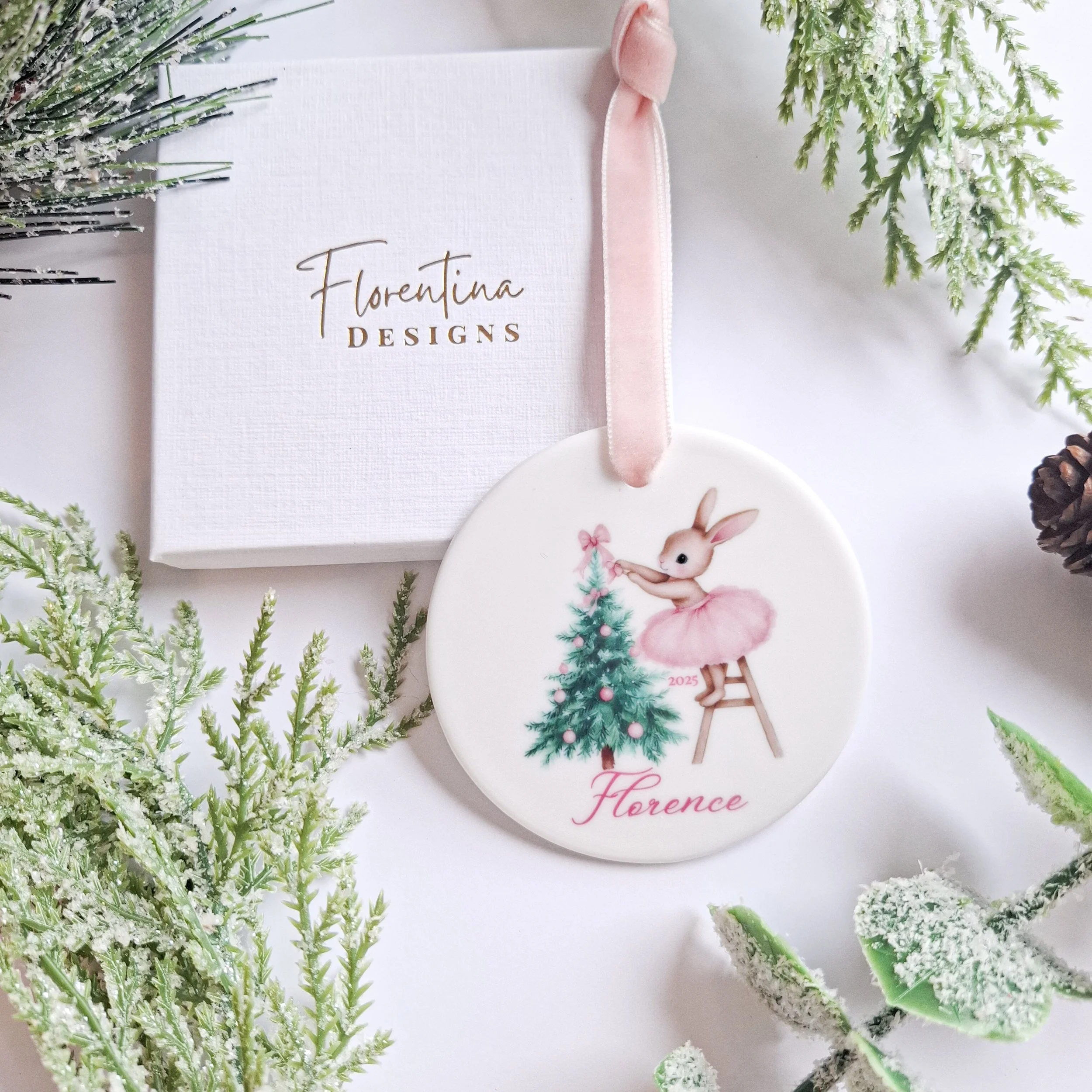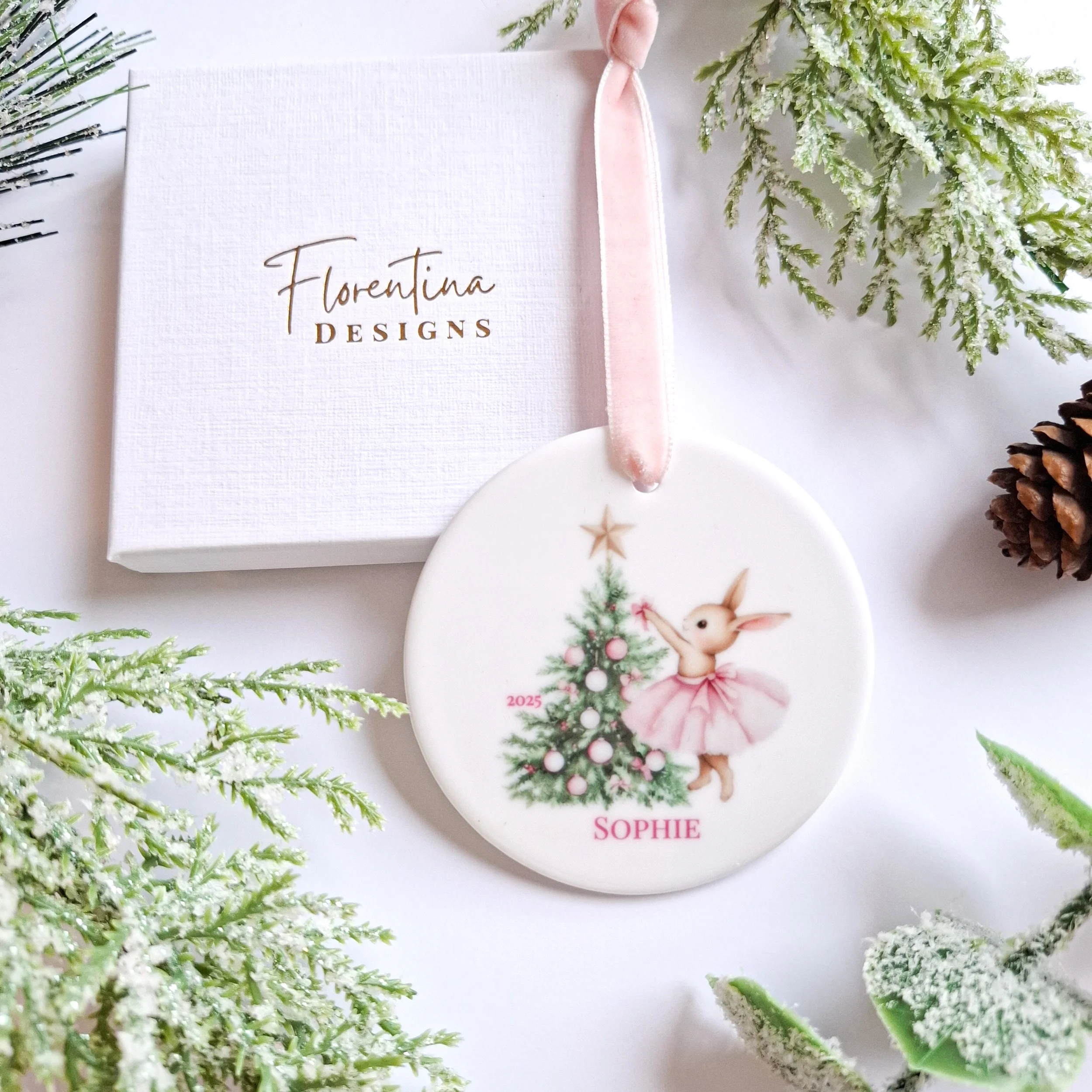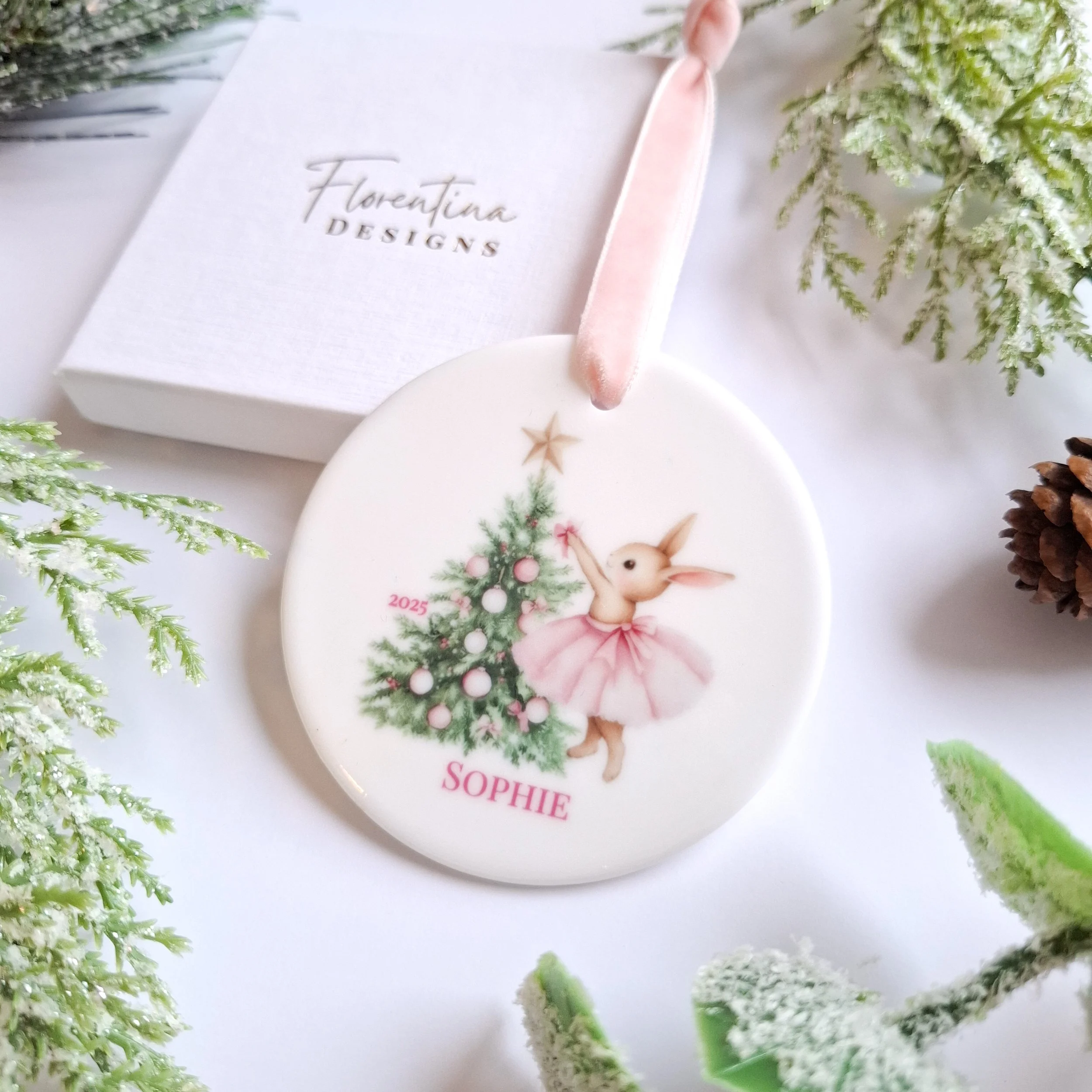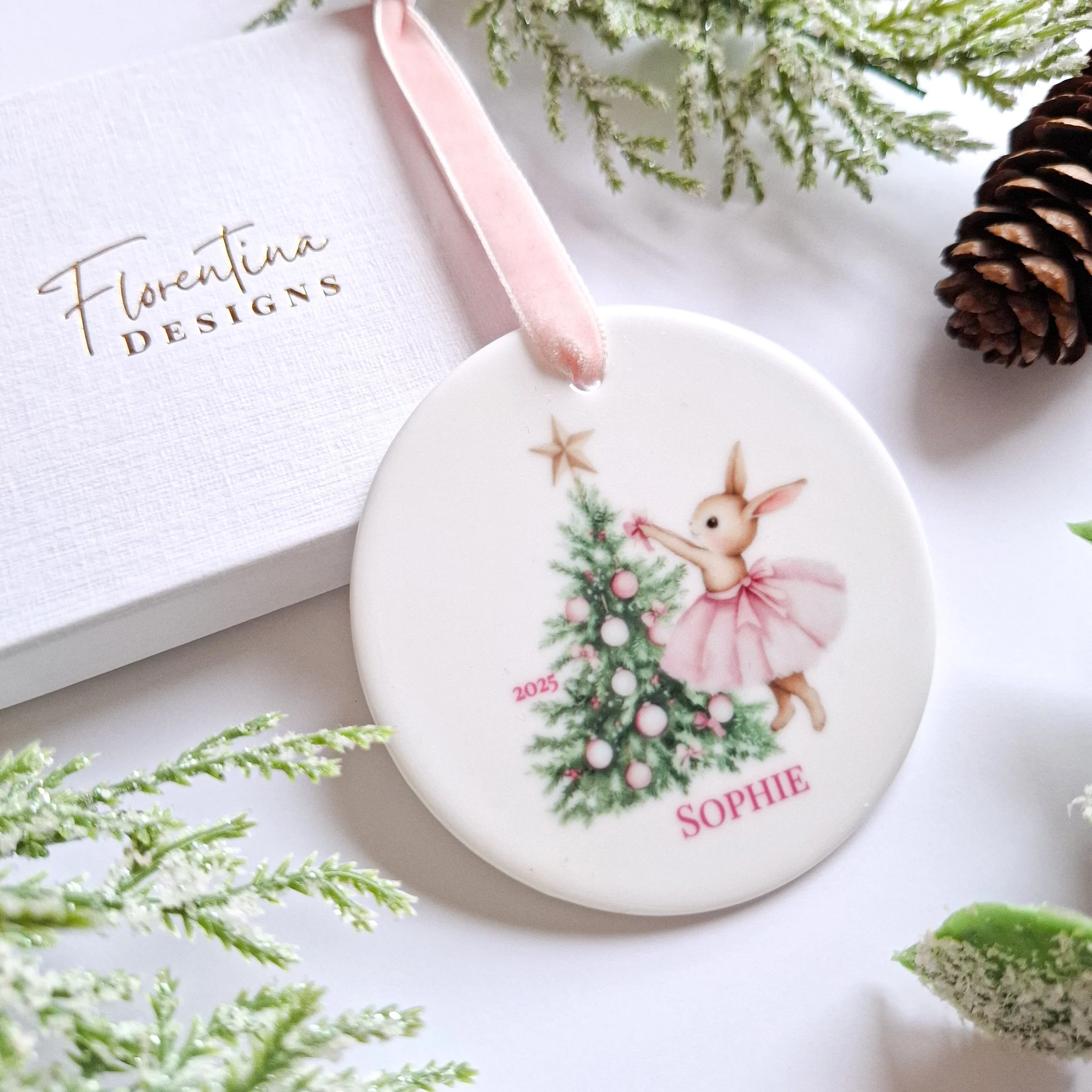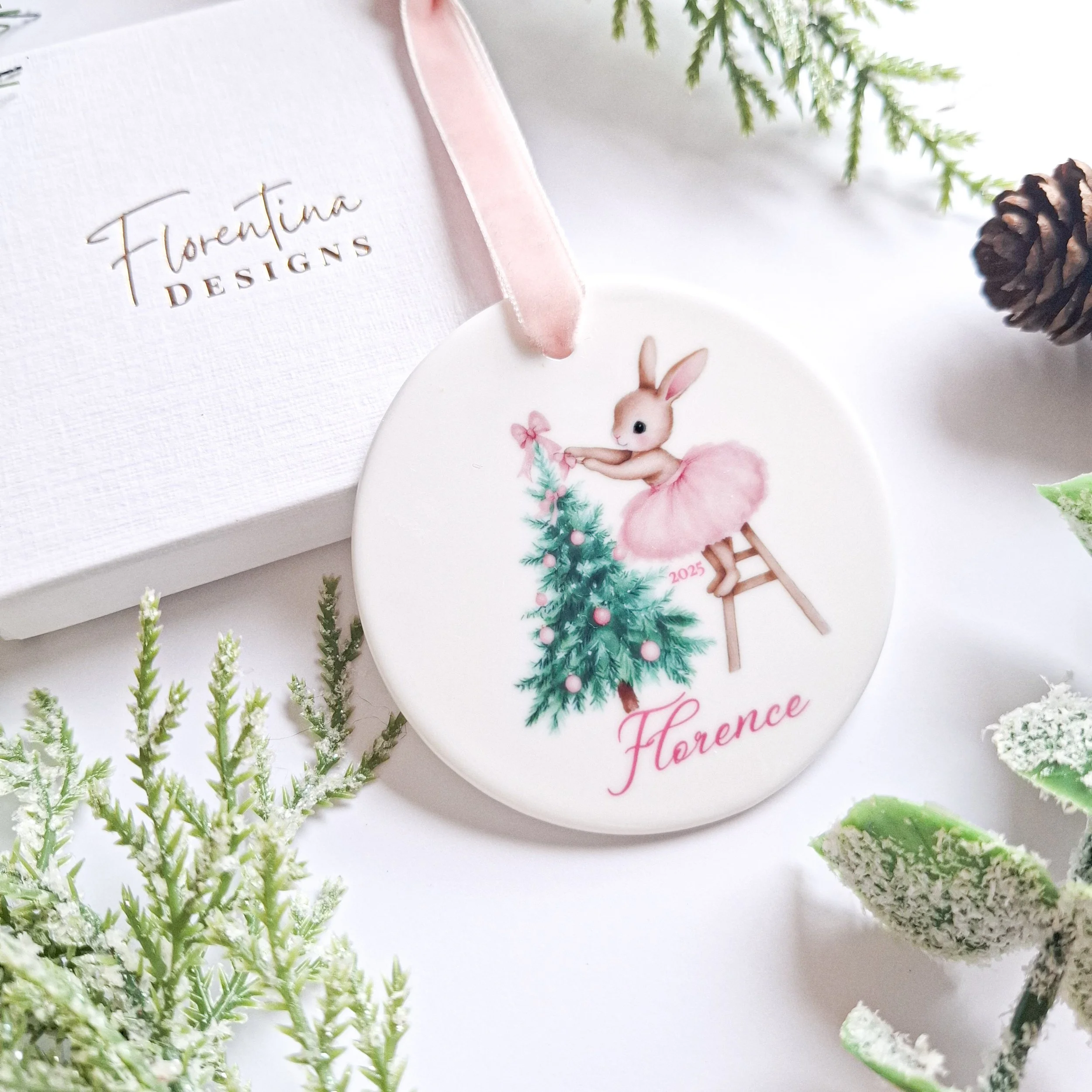 Personalised 2025 Bow Bunny Decoration – Tutu Bunny Decorating Tree with Pink Ornaments (Copy)