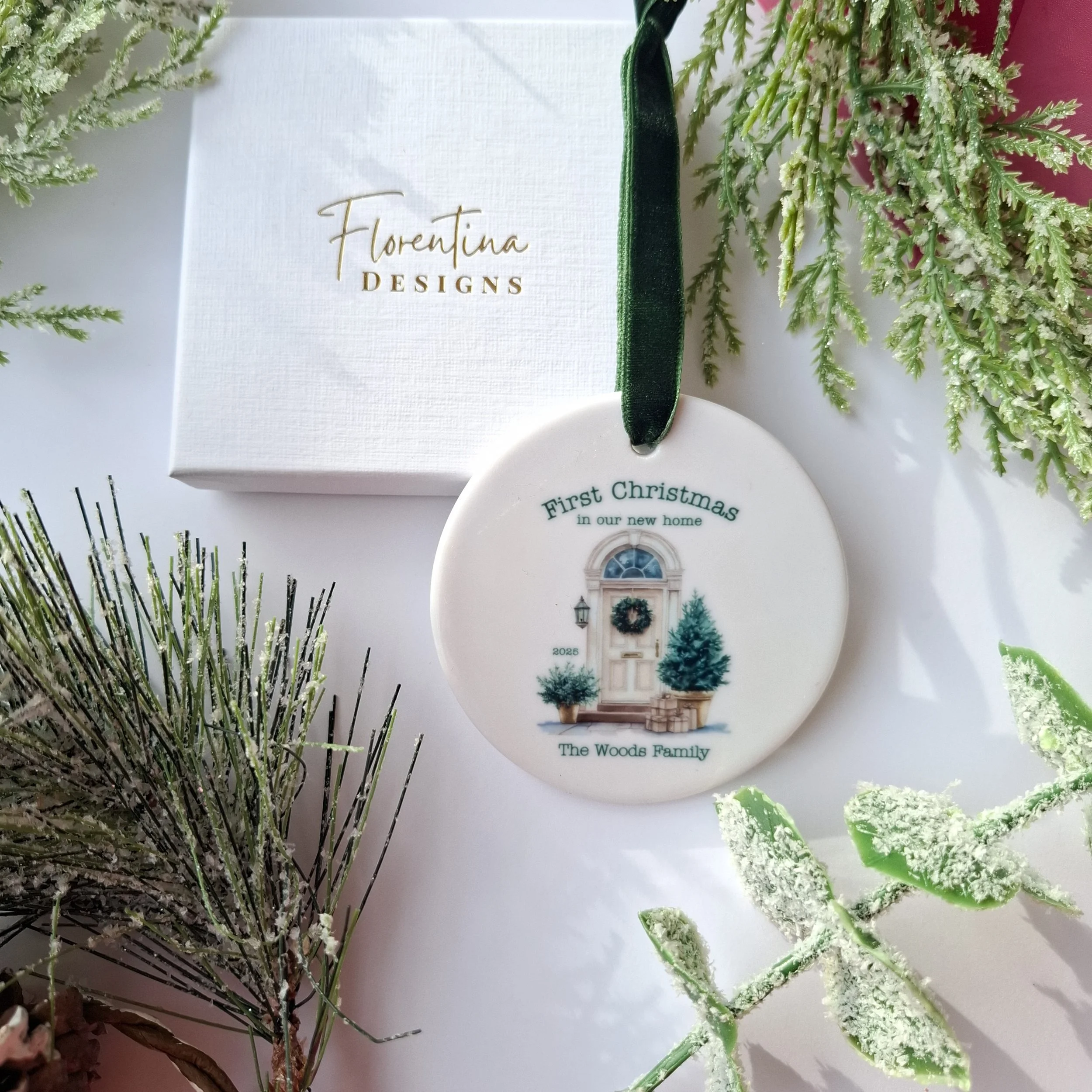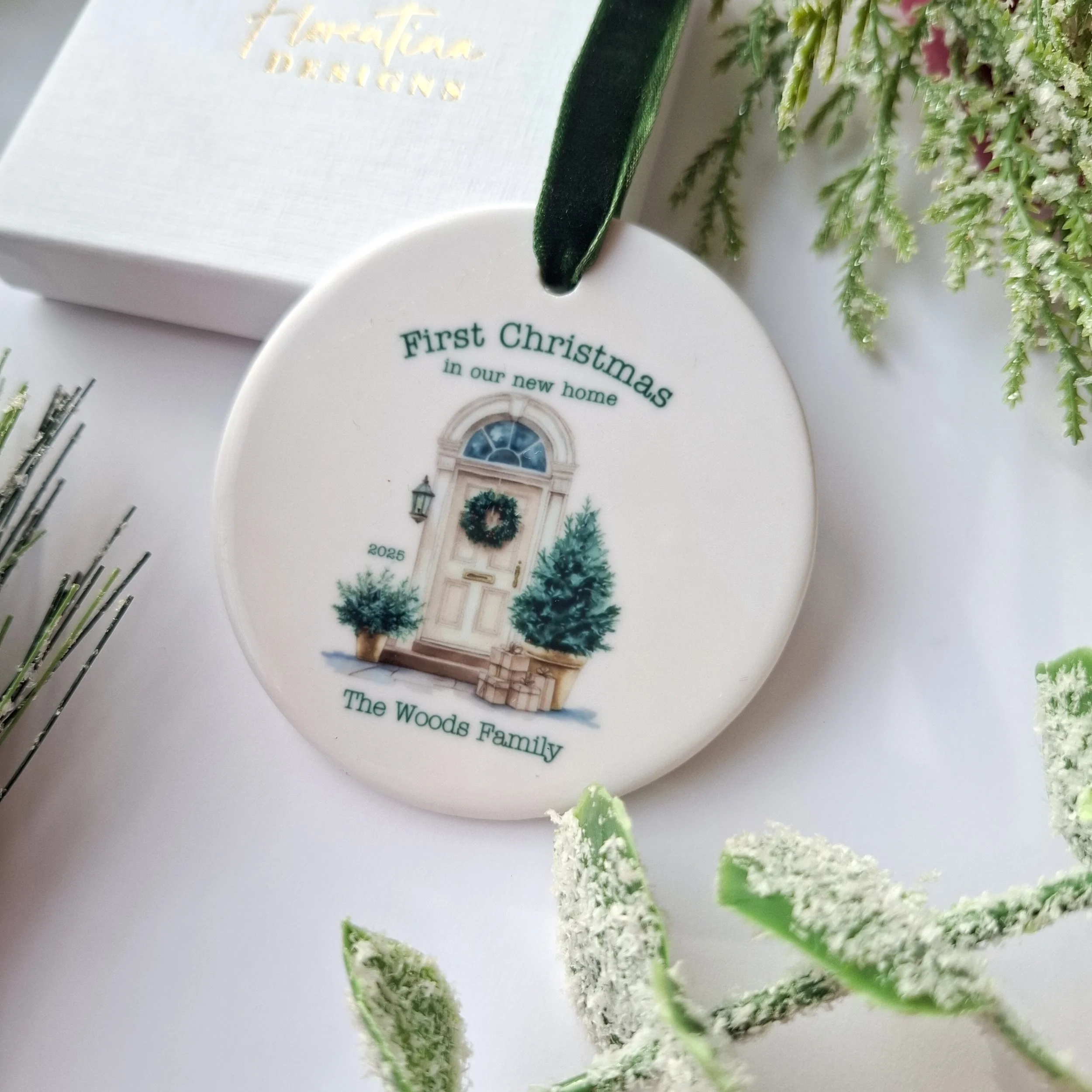 Personalised 2025 White Door “First Christmas in Our New Home” Ceramic Ornament