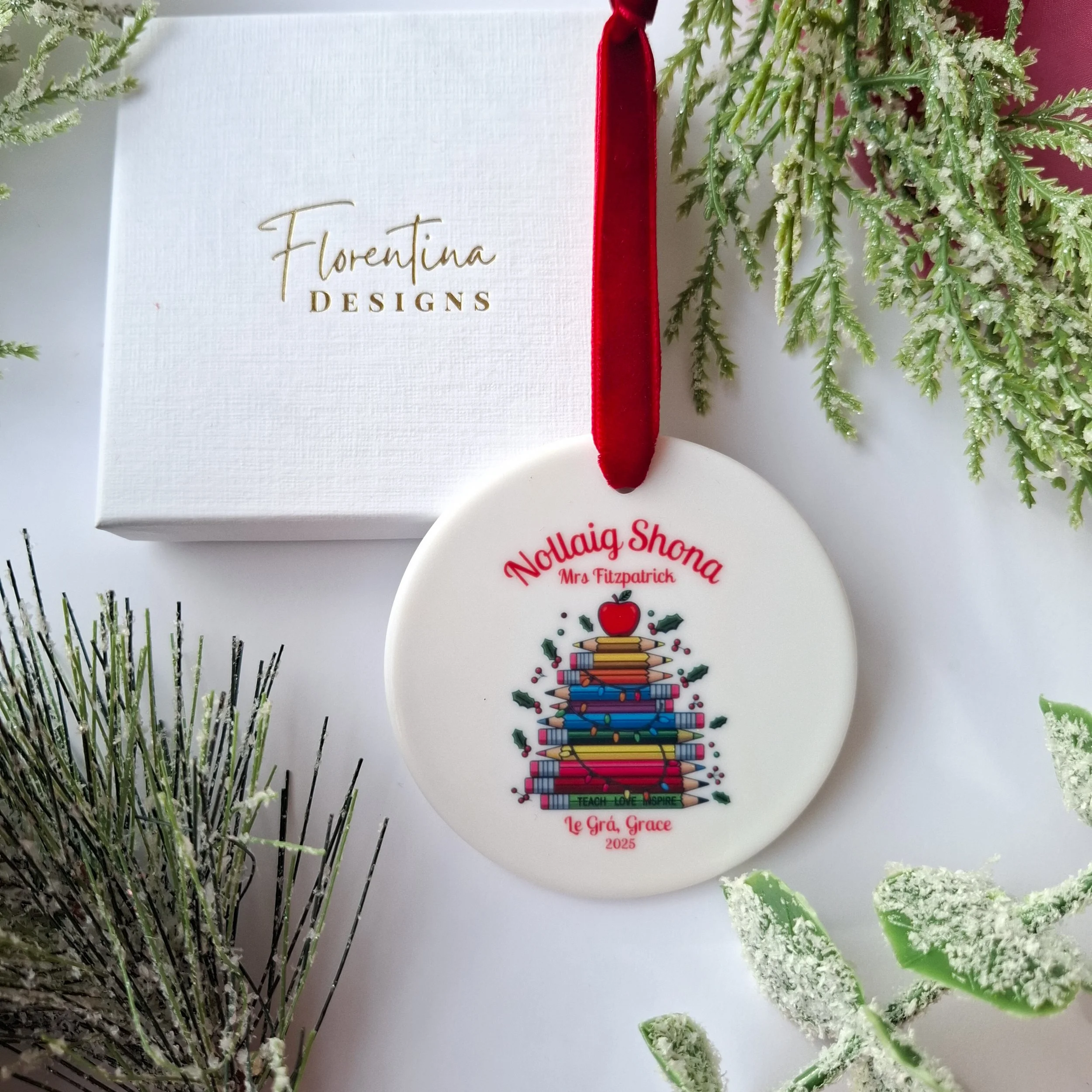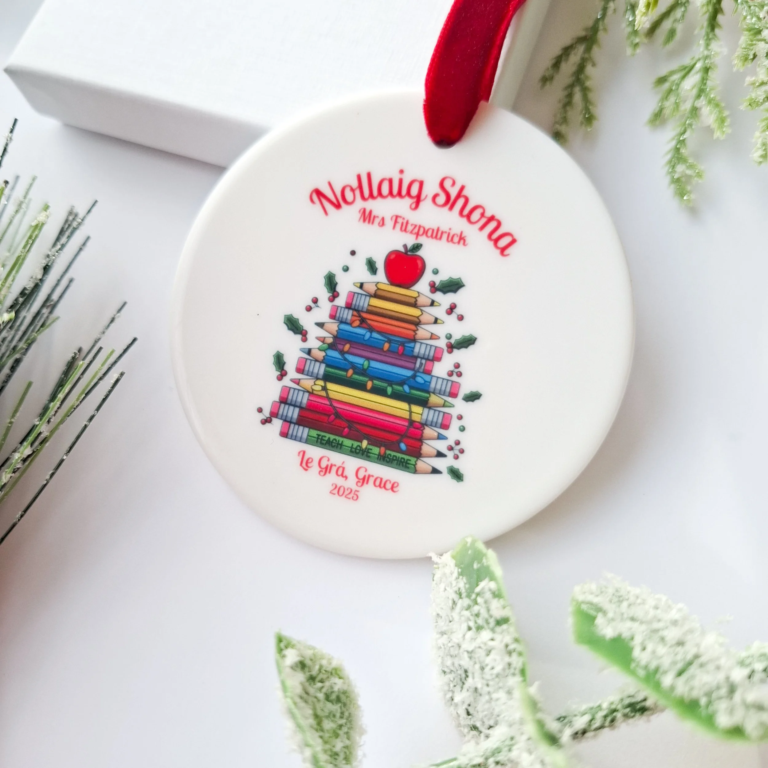 Personalised 2025 Irish Ceramic Pencils Christmas Decoration for Teachers – 'Nollaig Shona'