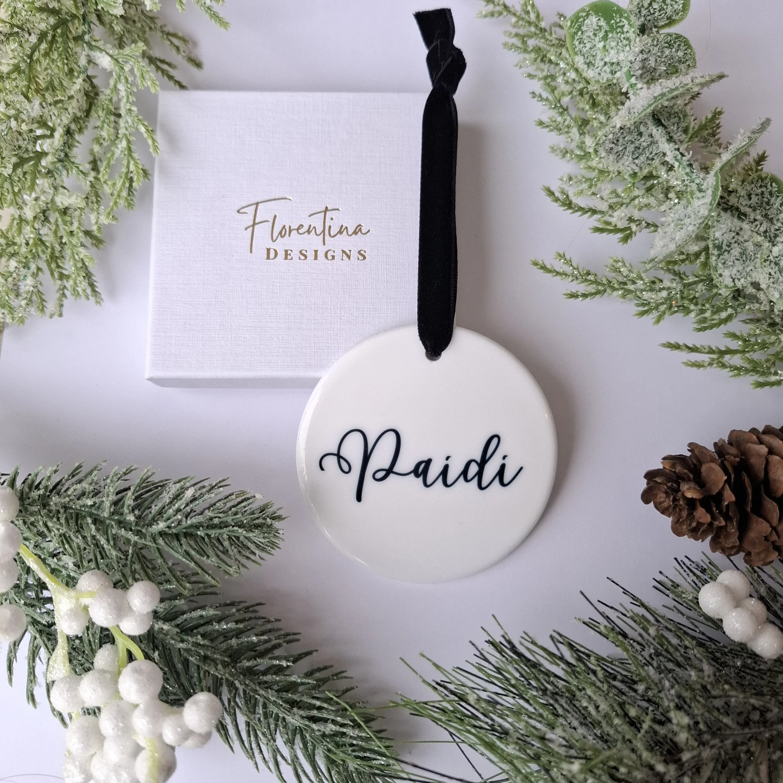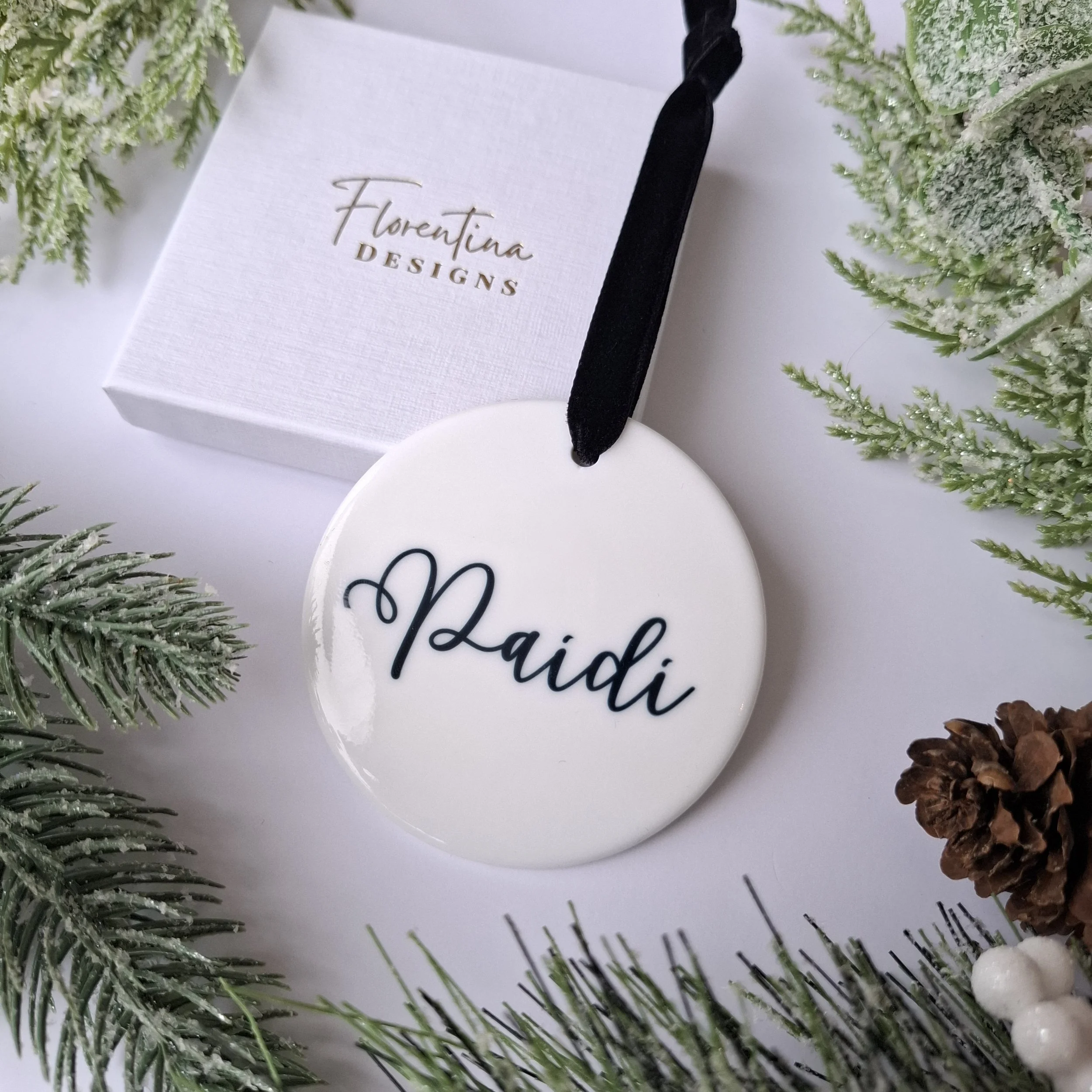 Each ornament is individually personalised with your chosen name in black writing, making it the perfect keepsake. Crafted from high-quality ceramic with a smooth, glossy finish, this beautiful decoration will shine on your tree year after year.