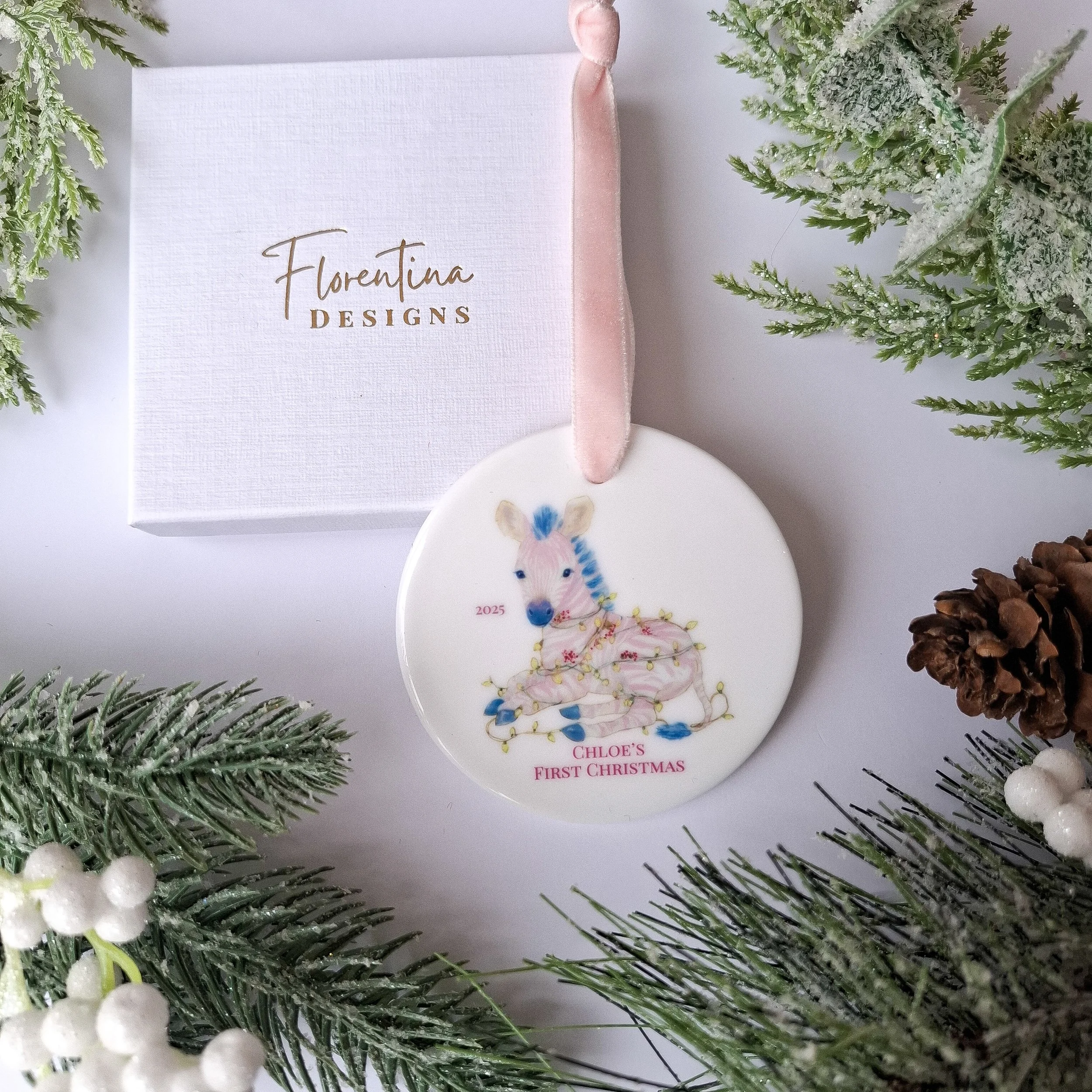 This beautiful decoration features a Baby Tiger with a sleigh full of presents, with soft festive shades of pink. Personalise it with a name (followed by First Christmas) and year to create a truly special ornament that captures the joy of Christmas 2025.