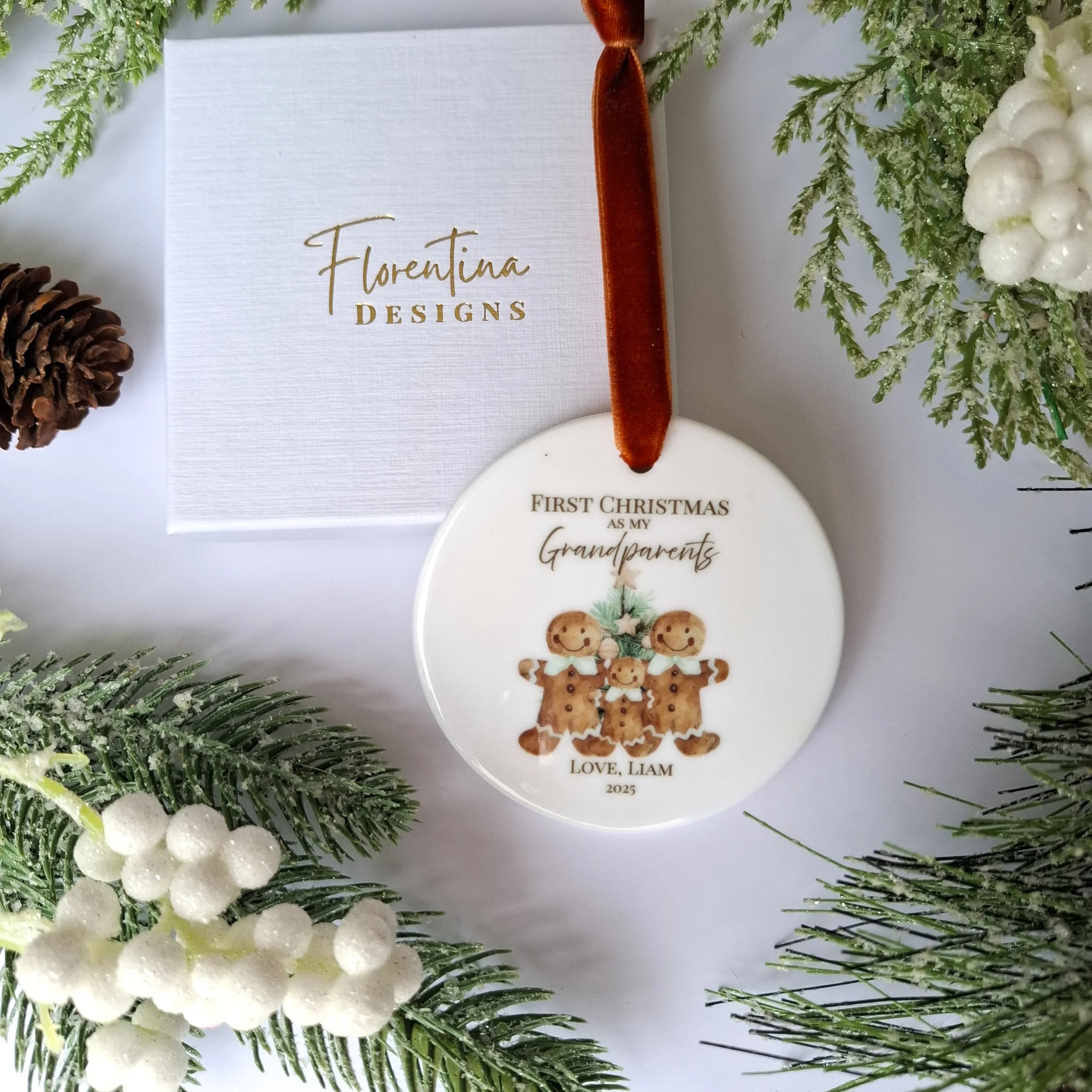 This 7.2 cm ornament features a sweet trio of gingerbread figures and the heartwarming phrase “First Christmas as my Grandparents’ Love (name).” Add your grandchild’s name and 2025 for a personal touch that will be cherished for years to come.