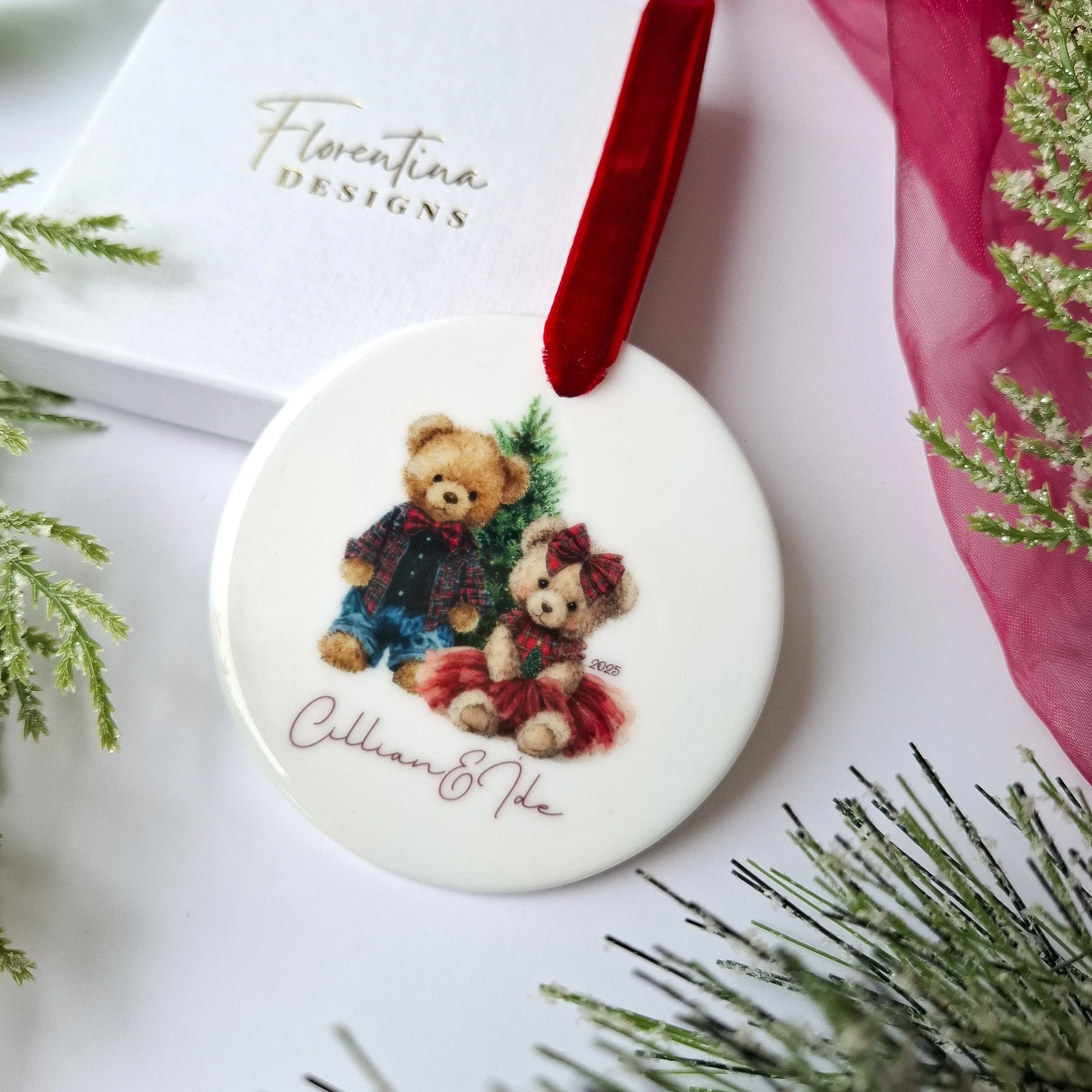 Celebrate the magic of Christmas with this delightful personalised ceramic decoration featuring an adorable girl bear and boy bear, dressed in festive outfits and sharing a joyful moment beside a beautifully decorated Christmas tree. Perfectly capturing the warmth and whimsy of the holiday season, this ornament is sure to bring smiles and festive cheer to your Christmas décor.