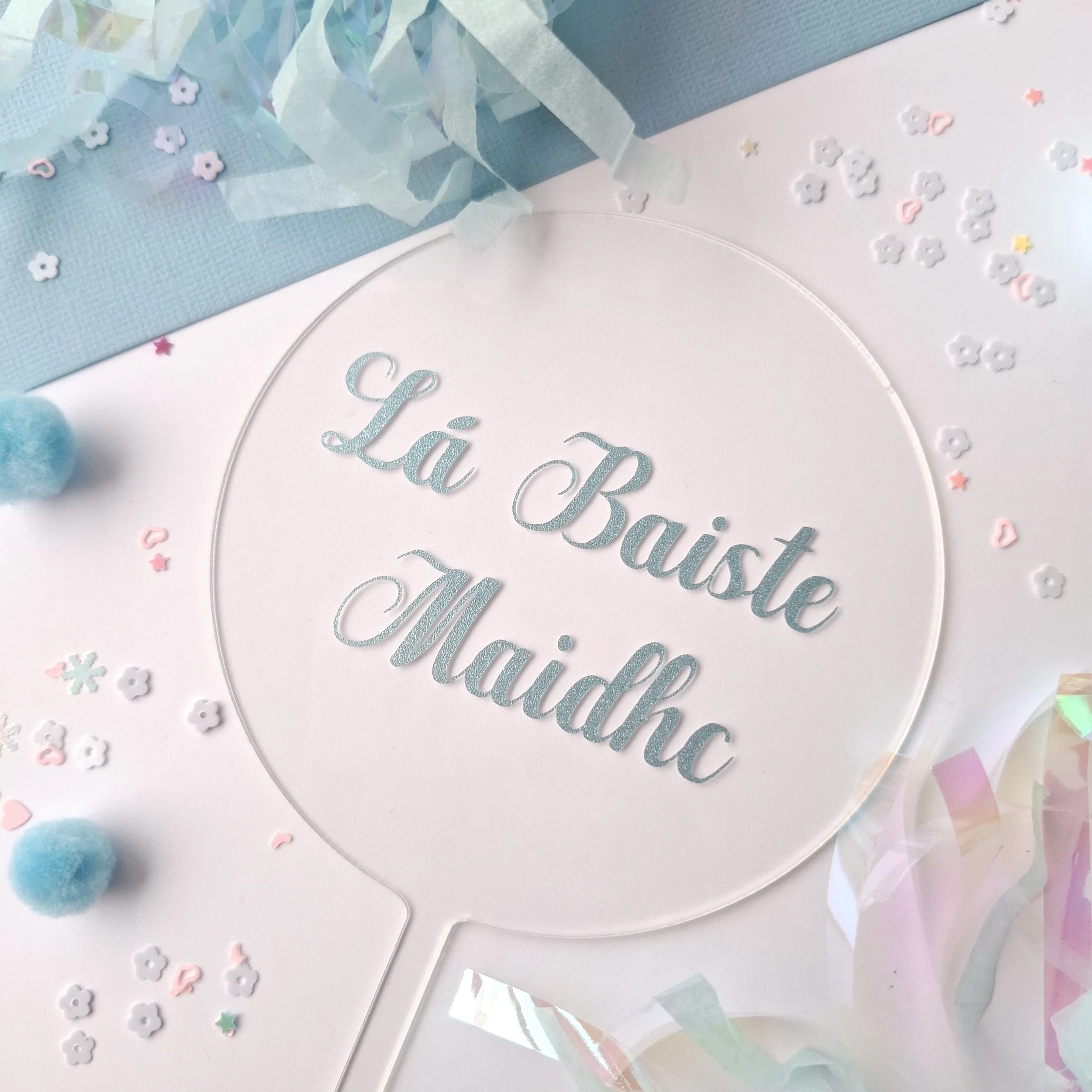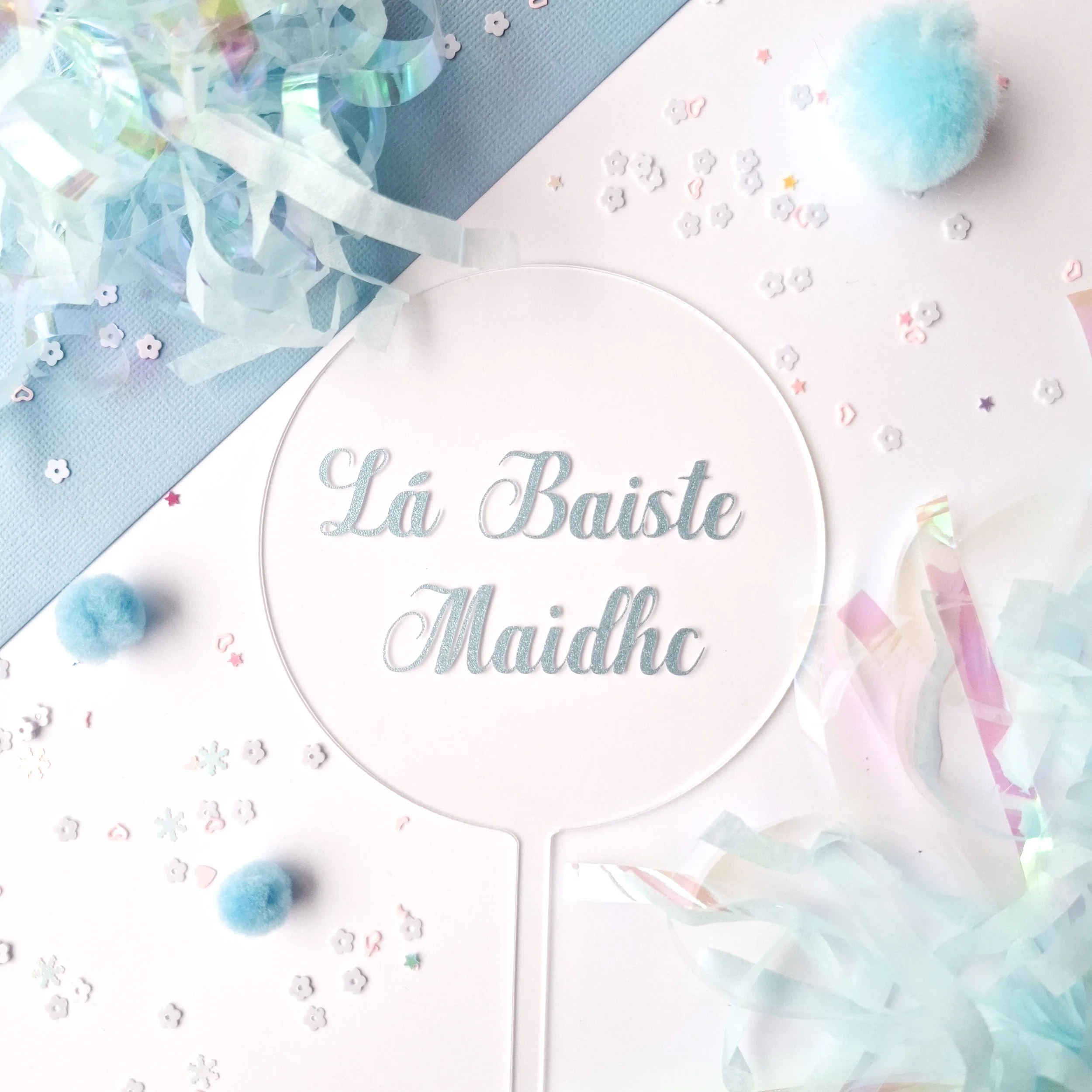 Add an extra special touch to a christening celebration with our personalised acrylic christening disc in Irish. This beautiful 15cm acrylic disc features the wording “Lá Baiste” followed by the child’s name, making it a meaningful keepsake for the day.