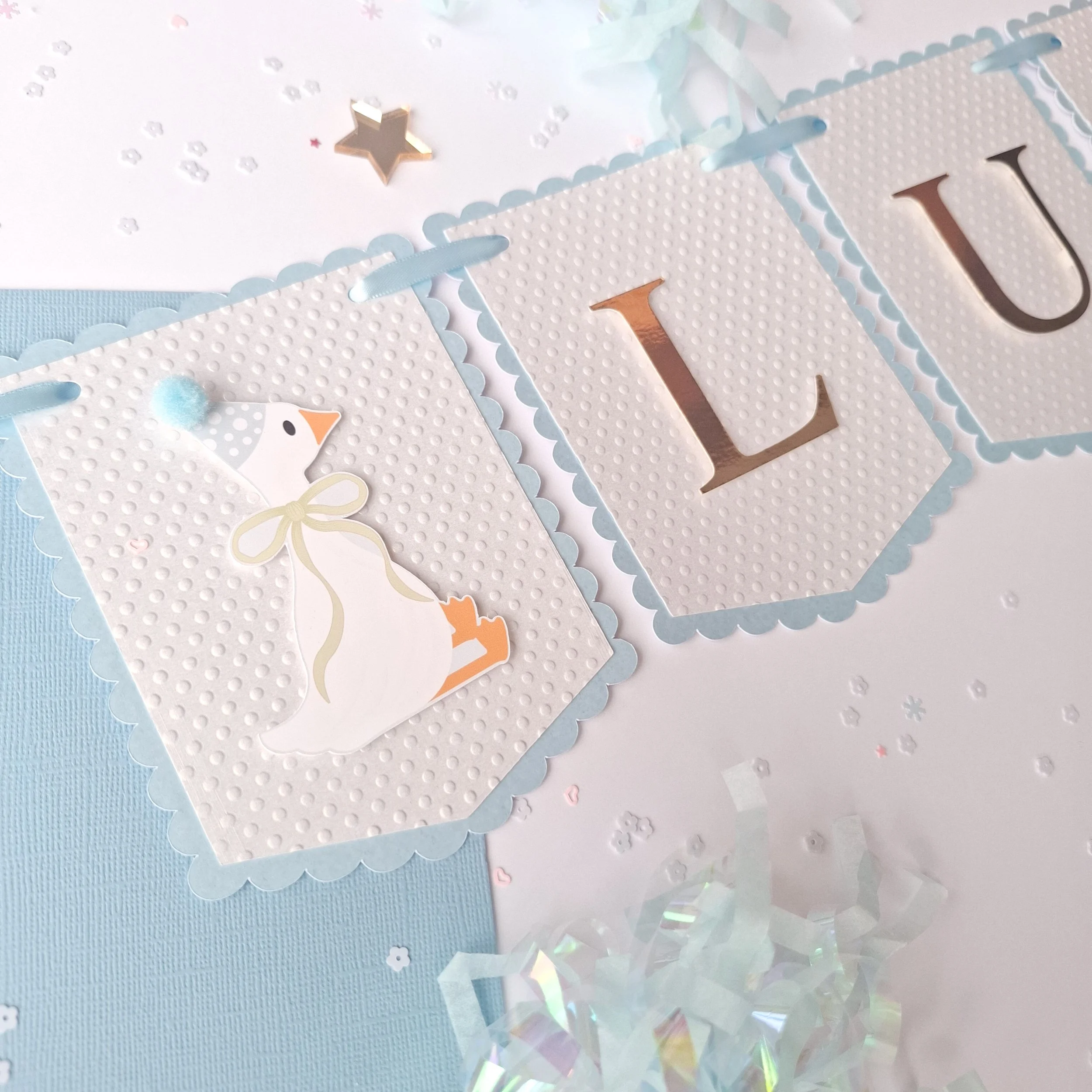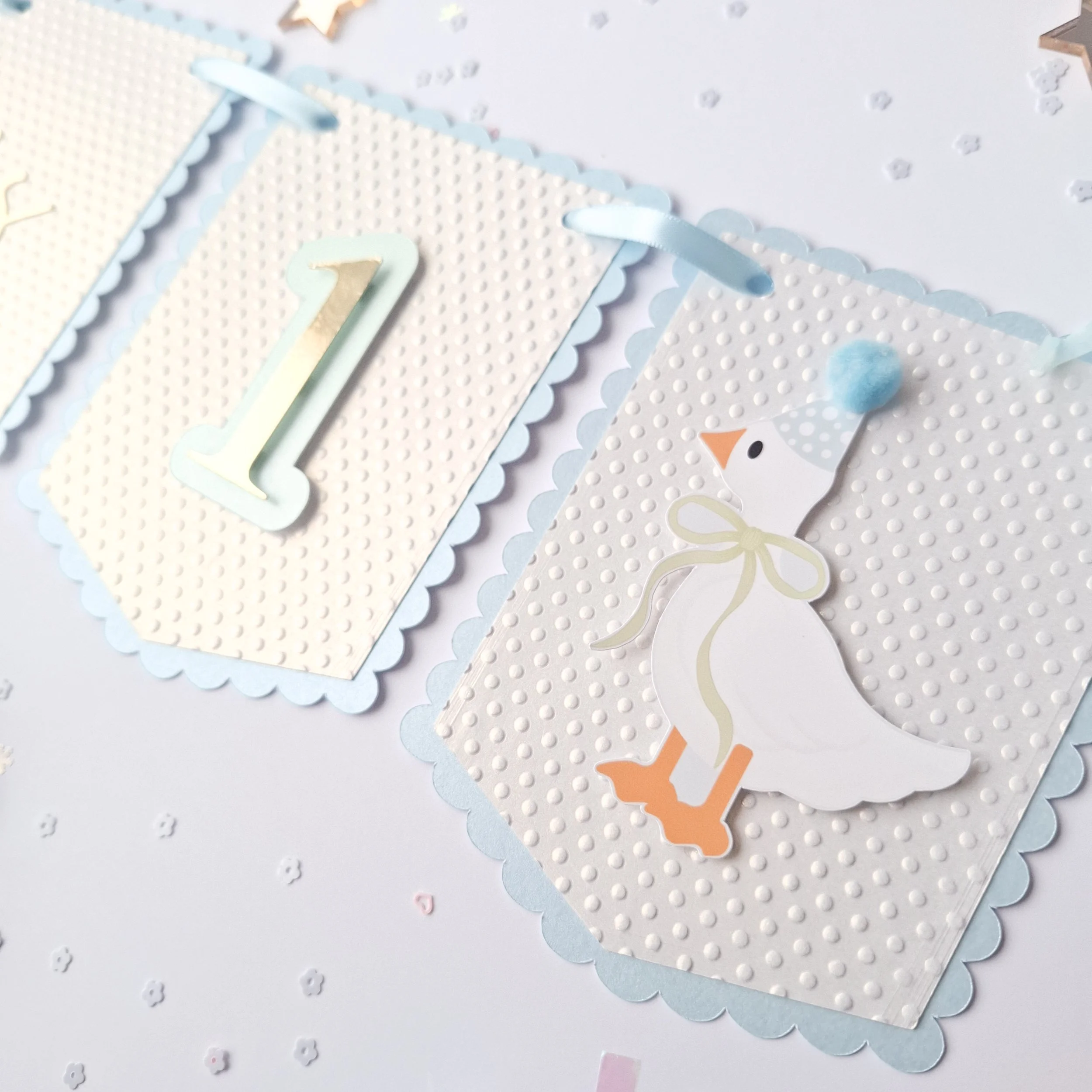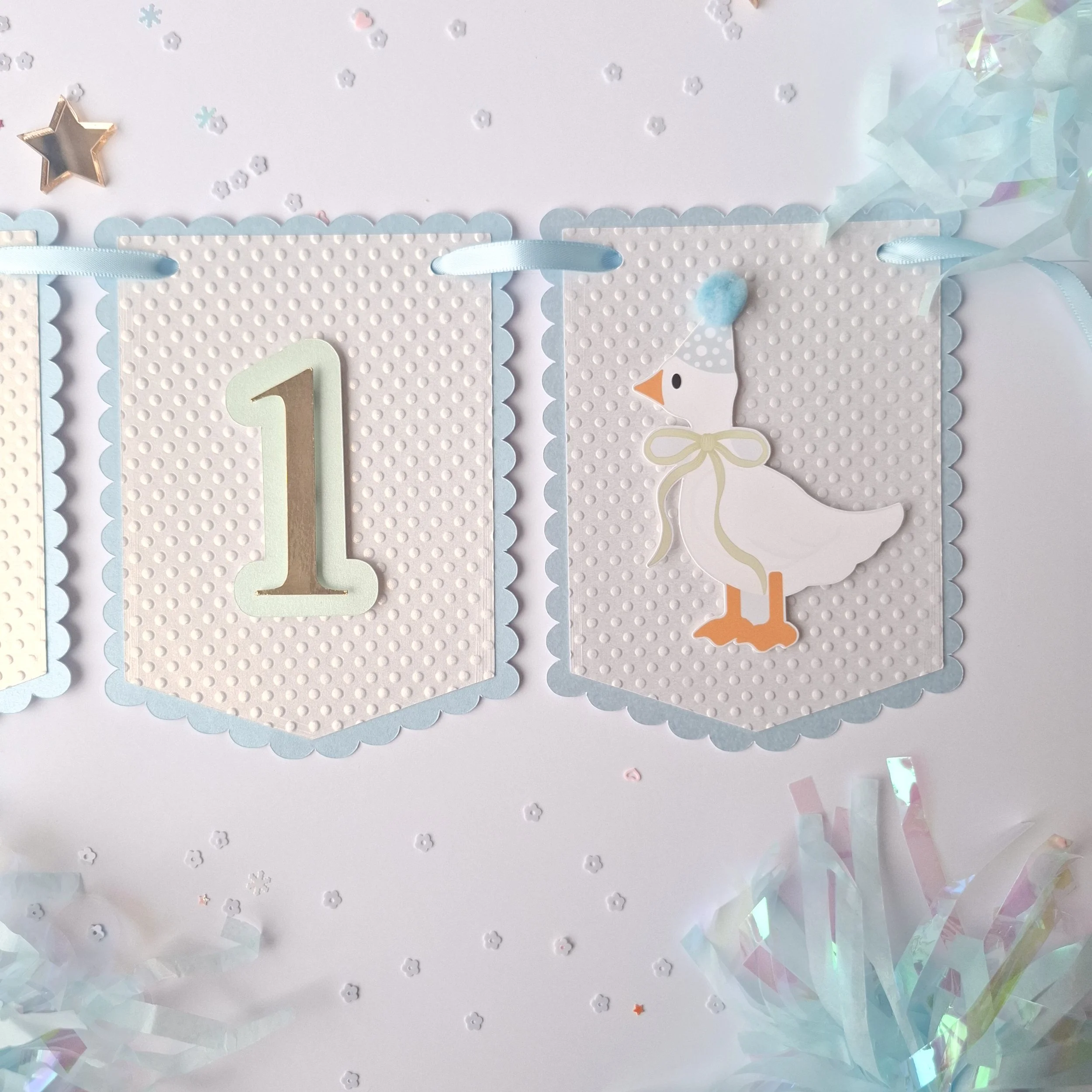 This charming banner reads “[Name] is 1” and features a delightful silly goose character at each end, adding a touch of sweetness to your celebration. Crafted in a blue and white colour scheme, it’s ideal for girly birthday parties with a quirky twist.